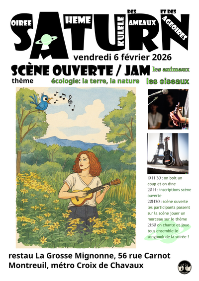 Les Soirées à Thème Ukulélé (SATURN), vous vous en souvenez ? C’était la saison 2022-2023, au Dampierre, les premiers samedis du mois… On y jouait en petite scène ouverte des chansons sur le thème du soir, avec au moins un ukulélé sur scène. Seul, c’était possible, mais accompagné, c’était encore mieux ! Et l’on continuait la… Lire la suite : SATURN revient ! vendredi 6 février à la Grosse Mignonne