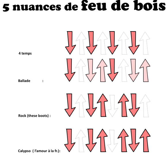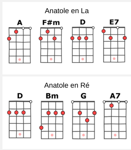 5 min d’exercices, accords, et rythme. On va jouer 4 séries de 4 accords « Anatole » avec 4 rythmes : 4 temps, Ballade, Pop Rock, et Calypso. Anatoles en La et en Ré !